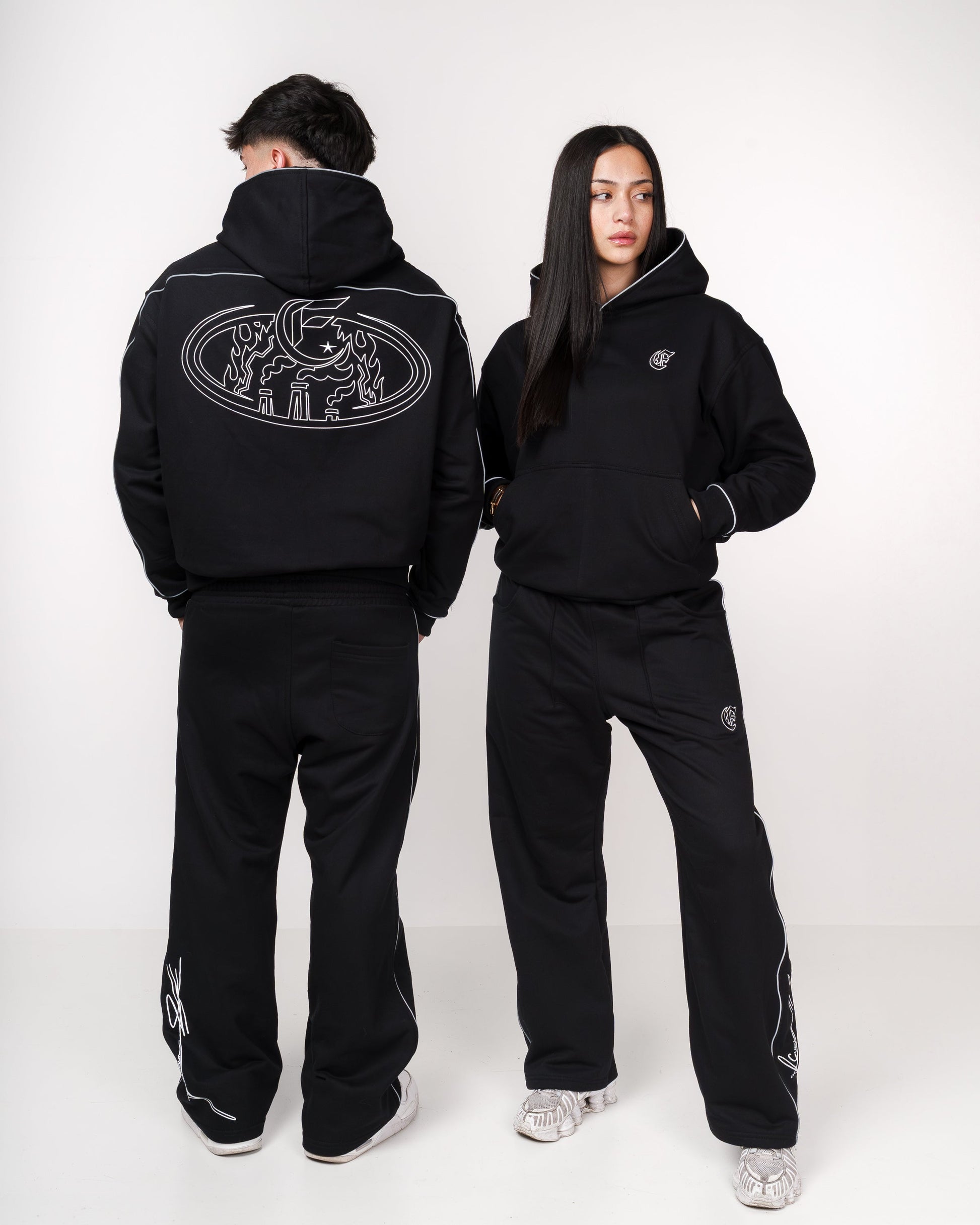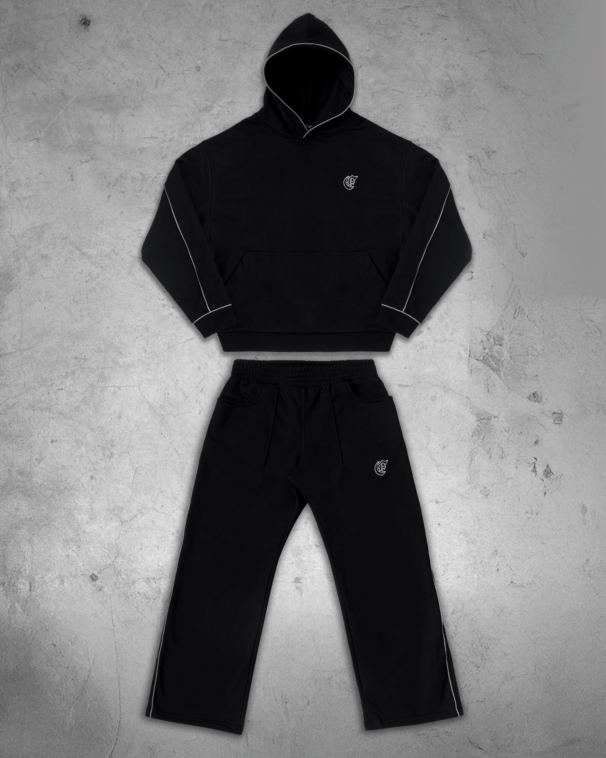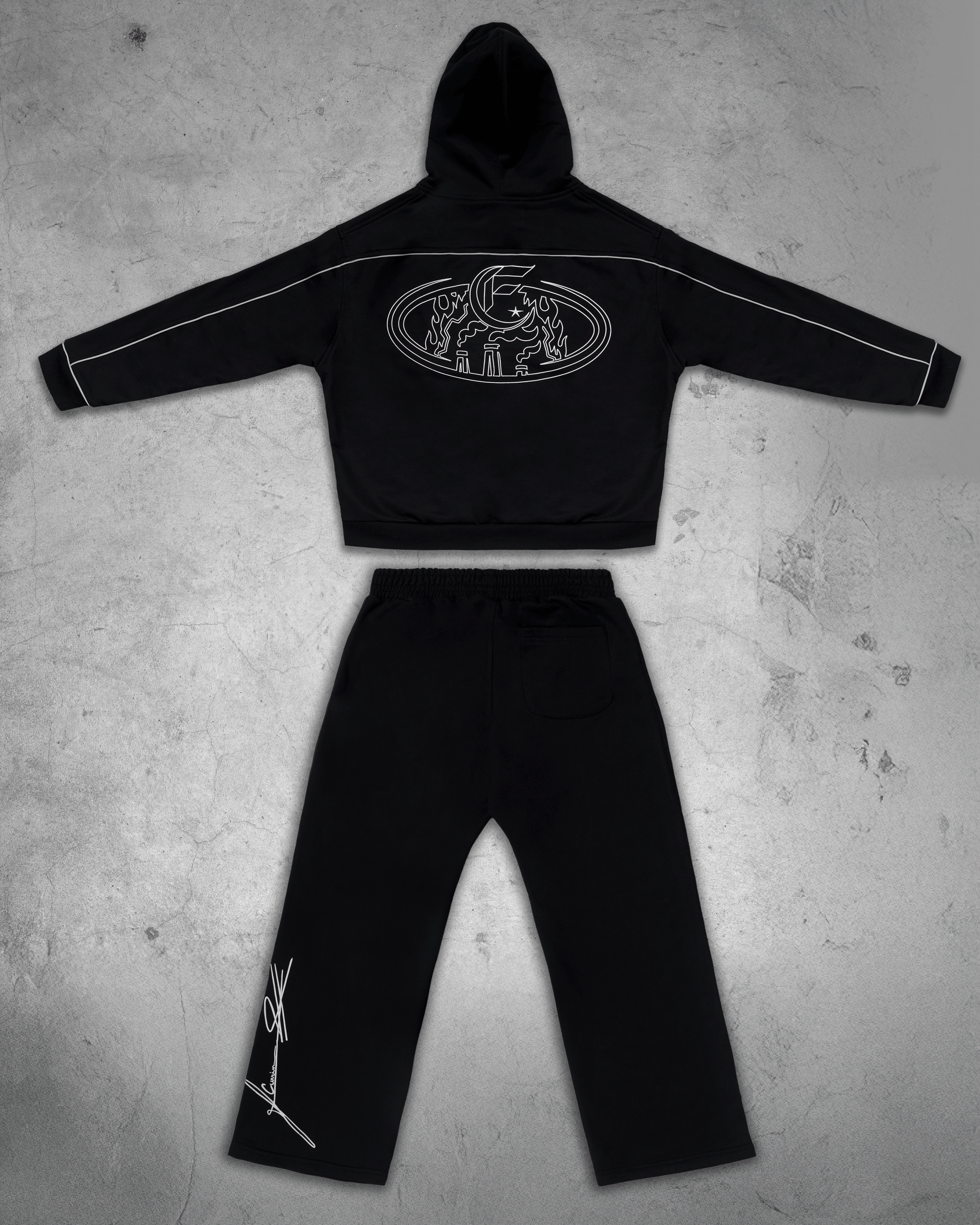 Este tracksuit negro está confeccionado con franela de algodón 70/30 que asegura comodidad y durabilidad. Cuenta con costuras reforzadas para mayor resistencia y los estampados son en serigrafía junto a logos bordados que aportan un acabado de calidad y duradero. tiene un clean fit que está pensado para ofrecer proporciones equilibradas y una caída impecable, para un fit limpio y cómodo tanto en el polerón como en el buzo.